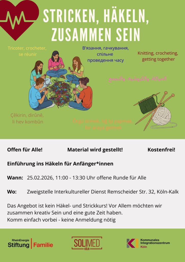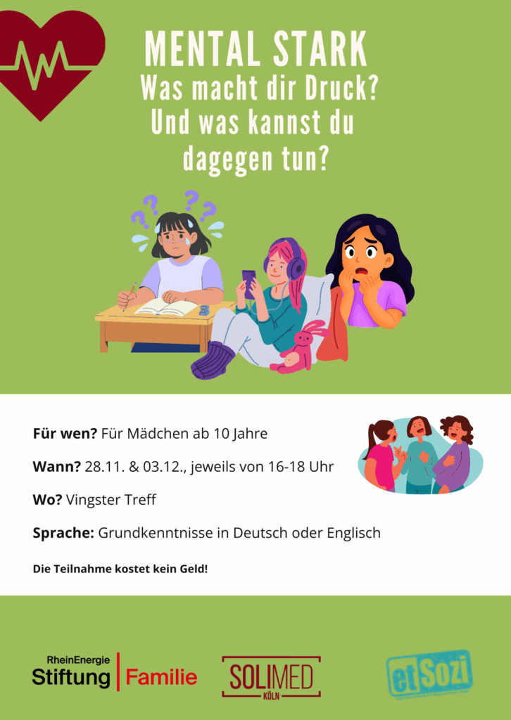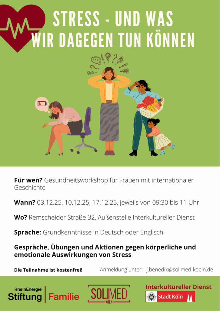 Gefördert von der RheinEnergieStiftung Familie setzen wir seit September 2024 ein Projekt zur Stärkung von Familiengesundheit in Kalk um. Wir wollen spezifische Gesundheitsressourcen stärken und Menschen miteinander in Kontakt bringen, die vor ähnlichen Herausforderungen stehen – ganz im Sinne der Verhältnisprävention, aber gedacht von der individuellen Situation.